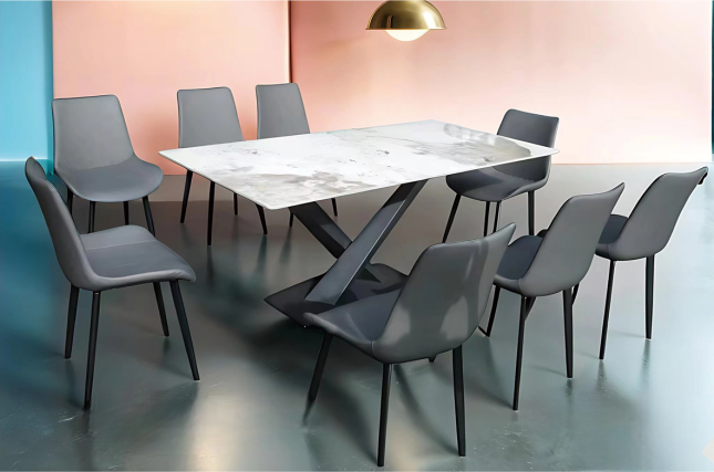 This striking dining set showcases a bold, modern design with a marble tabletop featuring soft grey veining for a sleek and sophisticated look. The table is supported by a dynamic X-shaped base in matte black metal, offering both stability and a contemporary aesthetic. Paired with eight comfortable grey upholstered chairs with a minimalist design, each with slender black legs, the set creates a stylish and inviting atmosphere. Perfect for modern dining rooms, this set blends luxury with functionality, offering a distinctive and eye-catching centerpiece for any contemporary home.
