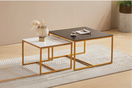 A striking set of two nesting coffee tables featuring a larger table with a black marble-effect tabletop and a smaller one with a white marble finish, both supported by sleek gold metal frames. The nested design enhances space efficiency while adding a bold, modern touch to any living area.