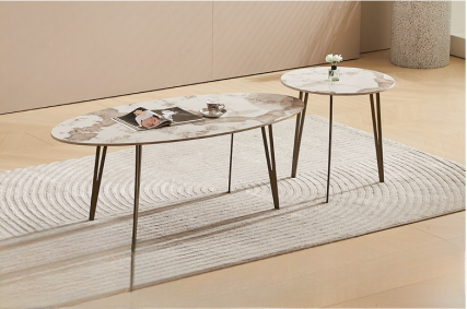 A graceful set of two nesting coffee tables with an oval larger table featuring a white marble-effect tabletop with subtle floral patterns, paired with a smaller round table, both supported by slender gold metal legs. The nested design adds a delicate yet modern touch to any living space.