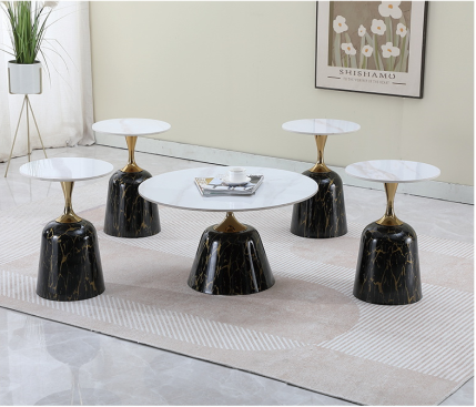 This sophisticated coffee table set combines striking black marble with elegant gold accents, creating a bold yet refined aesthetic. The main table, along with four smaller side tables, features a modern design with sleek marble tops and a unique gold tripod-style base. The luxurious contrast between the dark marble and gold detailing adds an opulent touch to any living space, making this set perfect for contemporary or high-end interiors. This set effortlessly blends style and functionality, elevating the elegance of your home decor.