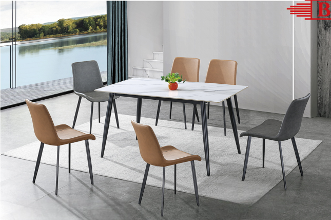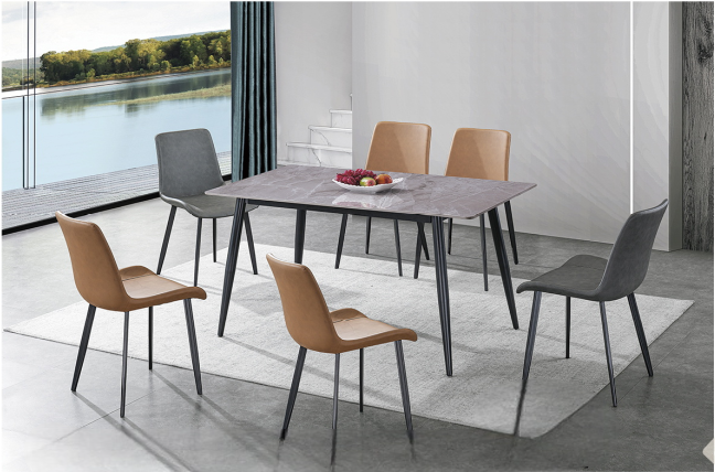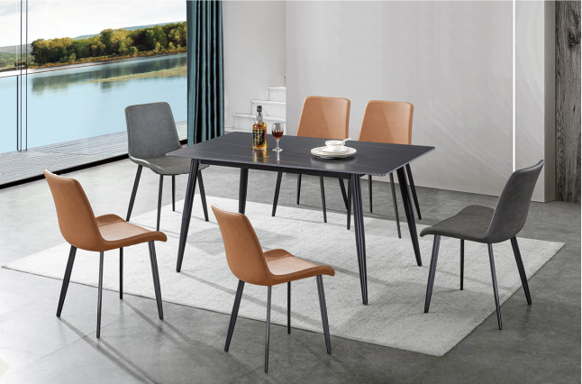 Bring style and comfort to your dining area with this sleek 6-seater dining set. Featuring a minimalist black dining table with sturdy metal legs and ergonomically designed chairs in warm tan and deep grey tones, this set perfectly balances sophistication and everyday comfort. Ideal for family meals or entertaining guests, it adds a modern touch to any home interior.