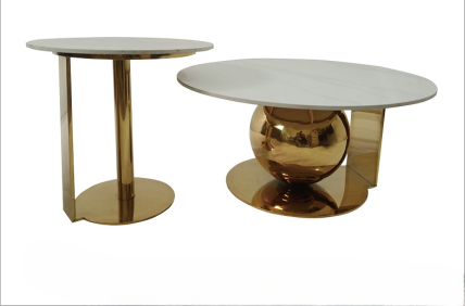 A luxurious set of two nesting coffee tables featuring round white marble-effect tabletops, with the larger table supported by a striking gold spherical base and the smaller table by a sleek gold column. The nested design adds a bold, glamorous touch to contemporary living spaces.