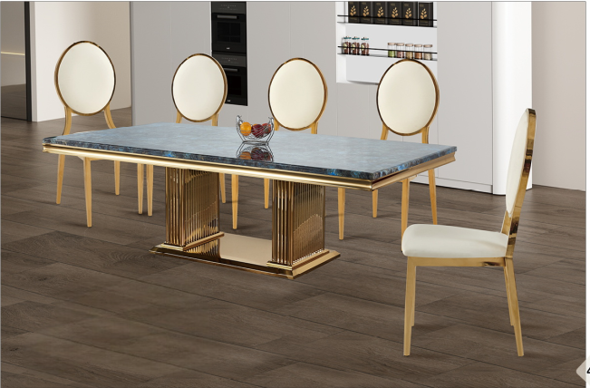 This luxurious dining chair features a distinctive round backrest with polished gold detailing, creating a modern yet elegant design. The soft white upholstered seat provides comfort while the gold accents on the legs and backrest add an opulent touch. The chair’s clean lines and sophisticated aesthetic make it an ideal choice for high-end dining rooms, offering both beauty and durability. Perfect for those looking to add a touch of glamour and refinement to their dining space.