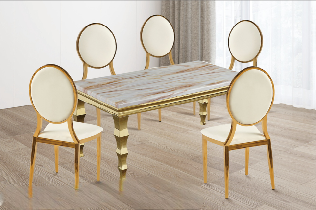 This exquisite dining set features a beautiful marble tabletop with soft, warm tones and subtle veining, creating an inviting and luxurious ambiance. The gold-trimmed edges and sculpted gold legs enhance the elegant design, adding a sophisticated touch. Paired with six matching chairs, each with a round, gold-framed backrest and sleek, golden legs, this set offers both comfort and grandeur. Perfect for refined dining spaces, it combines modern style with classic luxury, making it an ideal centerpiece for any upscale dining room.