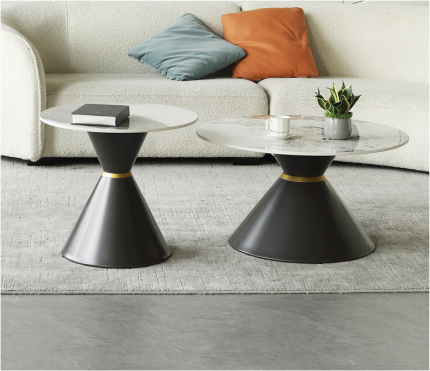 A modern set of two nesting coffee tables featuring round white marble-effect tabletops and striking black conical bases with gold accents. The nested design, with the smaller table fitting under the larger one, provides a stylish and space-efficient option for contemporary living rooms.