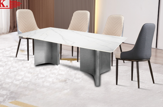 This modern dining set features a beautifully simple marble tabletop with smooth white and grey veining, giving it a sleek and luxurious appearance. The table is supported by clean, contemporary stainless steel bases that offer both durability and a bold, minimalist aesthetic. Paired with four elegant chairs, two in soft beige and two in textured grey, each chair is designed for comfort with high backs and stylish metal legs. Perfect for contemporary or industrial-style interiors, this set combines luxury and functionality with a refined, modern touch.