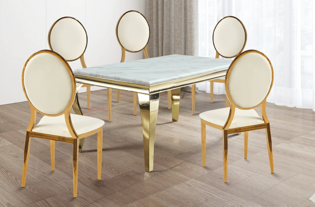 This luxurious dining set exudes a timeless elegance with a light marble top that showcases soft, subtle veining, complemented by a glossy gold border. The table’s chic golden legs create a sense of opulence while maintaining a contemporary feel. Paired with five sophisticated chairs featuring round, gold-trimmed backs and sleek, matching gold legs, the set offers both comfort and style. Ideal for creating a glamorous and welcoming dining area, this set adds an air of sophistication to any modern space with its harmonious blend of marble and gold.