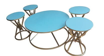 A bold set of five nesting coffee tables featuring oval and round tabletops in a striking blue finish, supported by elegant gold metal frames with a crisscross base design. The nested configuration, with four smaller tables fitting around the larger central table, adds a vibrant and versatile touch to modern living spaces.