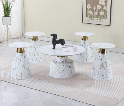 This stunning coffee table set blends modern elegance with a touch of luxury. The white marble tops are beautifully accented by gold flecks, creating a sophisticated and unique design. The main table is complemented by four smaller side tables, each with a sleek and modern shape supported by golden metal rings. This set’s combination of white and gold offers a light, airy aesthetic, perfect for adding a glamorous touch to contemporary or minimalist interiors. Ideal for those seeking a refined and chic addition to their living room.